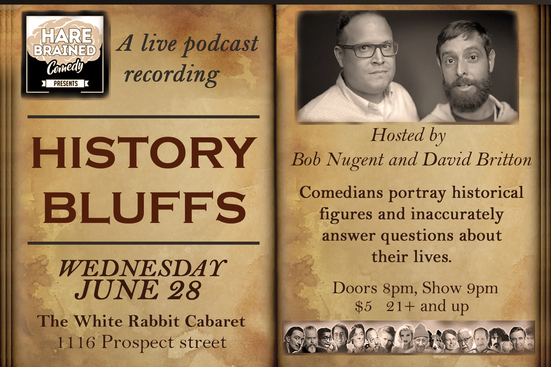 History Bluffs is a comedy podcast where co-hosts Jonas Schrodt and Bob Nugent quiz famous dead people about their hilarious and mostly awful lives! Each episode features a guest comedian that is unaware of which famous dead person they will be portraying until the recording actually begins. It's part interview, part history lesson, part hilarious improvised lying!