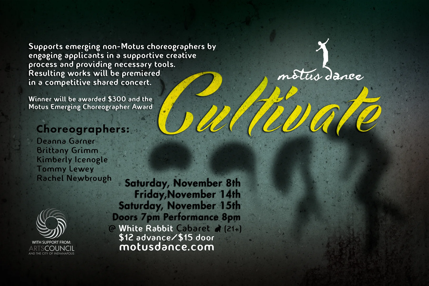 Cultivate is a choreographic experience that is open Indy’s emerging choreographers. Choreographers will create and participate in a shared concert. Motus is providing the space for choreographers, who might not otherwise be able to put on their own show by assisting with auditions for dancers, rehearsal space, peer feedback, promotion and performance space. One choreographer will also receive the Motus Emerging Choreographer Award and a prize.
