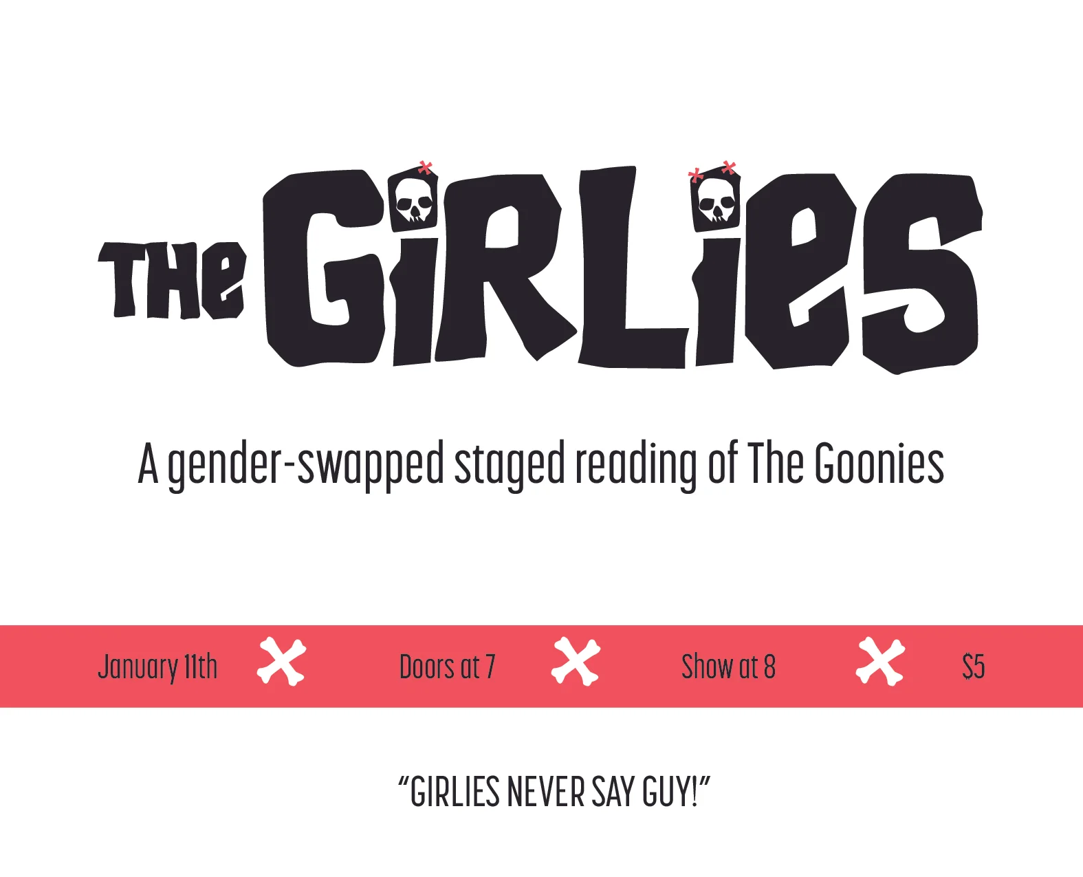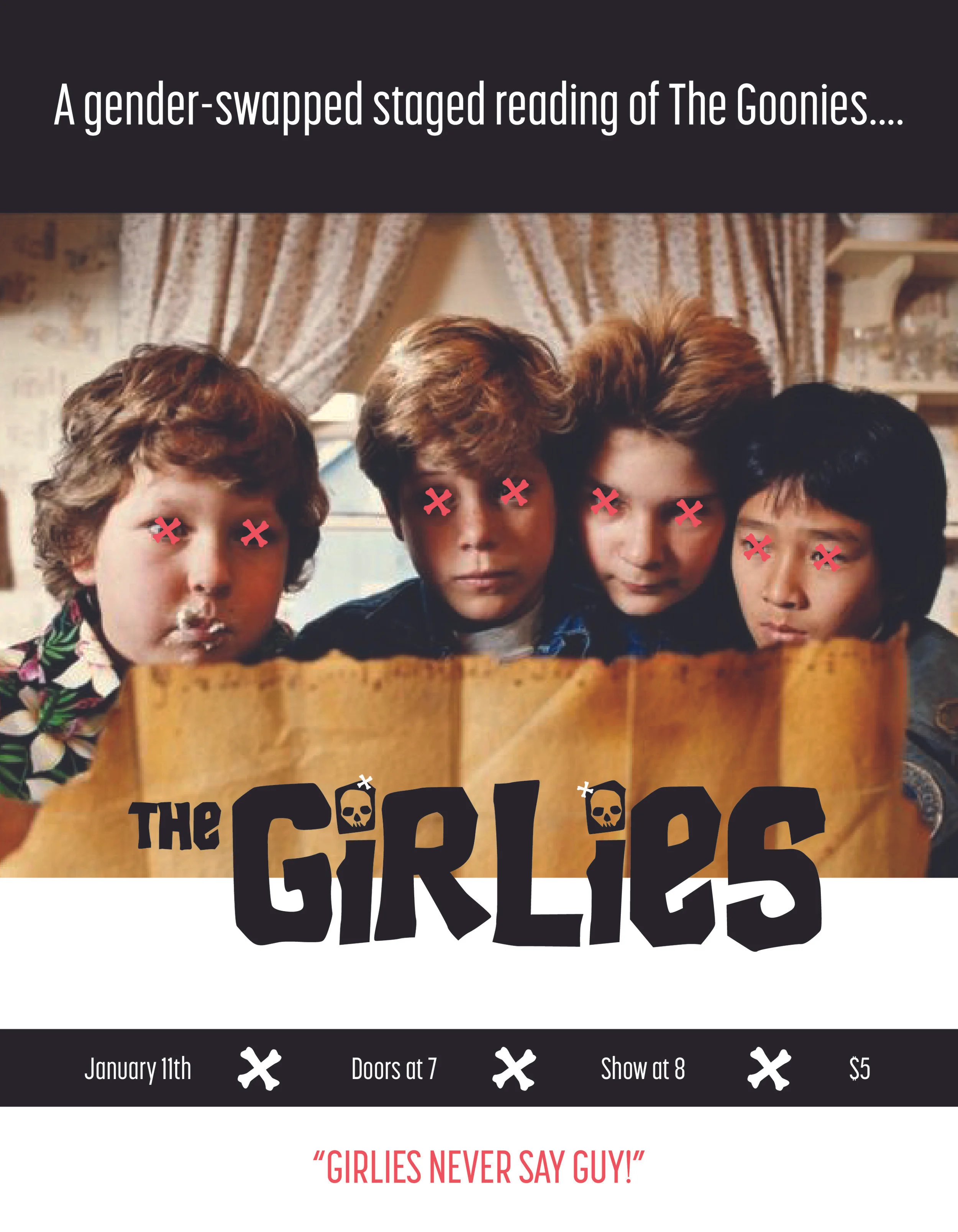 Join us for a gender-swapped, live-action reading of the 1985 cult classic, 'The Goonies' at The White Rabbit Cabaret featuring some of Indy's funniest ladies. Doors at 7, show at 8. Only $5 Remember, GIRLIES never say GUY.