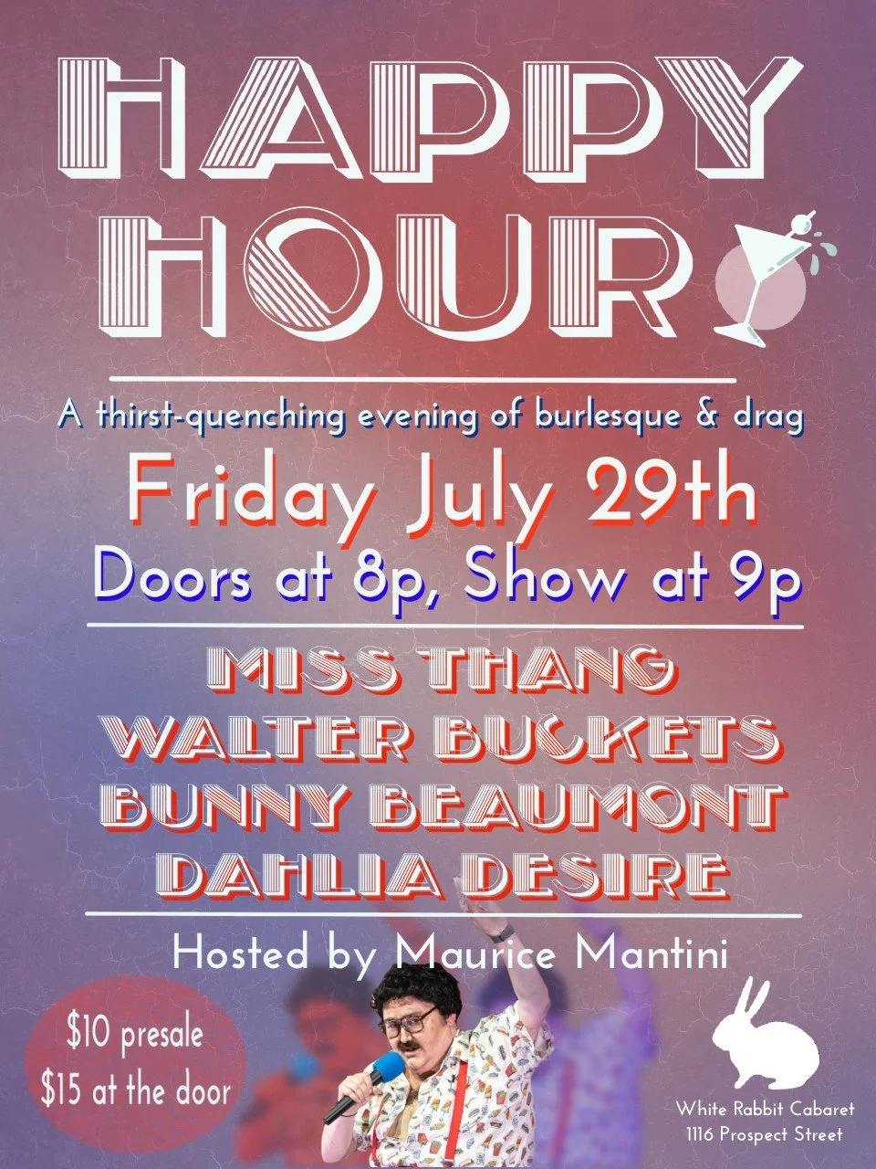 Join your favorite drag daddy, Maurice Mantini, for a night of thirst-busting entertainment! Wet your whistle at the White Rabbit’s top-notch bar and settle in for a helluva show. Drink in the lights, the music, and finally—the sensual, unconventional, and utterly mind-blowing talent taking the stage. Maurice is serving you a mix of regional drag and burlesque performers offering up acts that will make you blush and leave you begging for more.