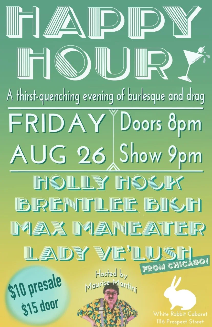Join your favorite drag daddy, Maurice Mantini, for a night of thirst-busting entertainment! Wet your whistle at the White Rabbit’s top-notch bar and settle in for a helluva show. Drink in the lights, the music, and finally—the sensual, unconventional, and utterly mind-blowing talent taking the stage. Maurice is serving you a mix of regional drag and burlesque performers offering up acts that will make you blush and leave you begging for more.