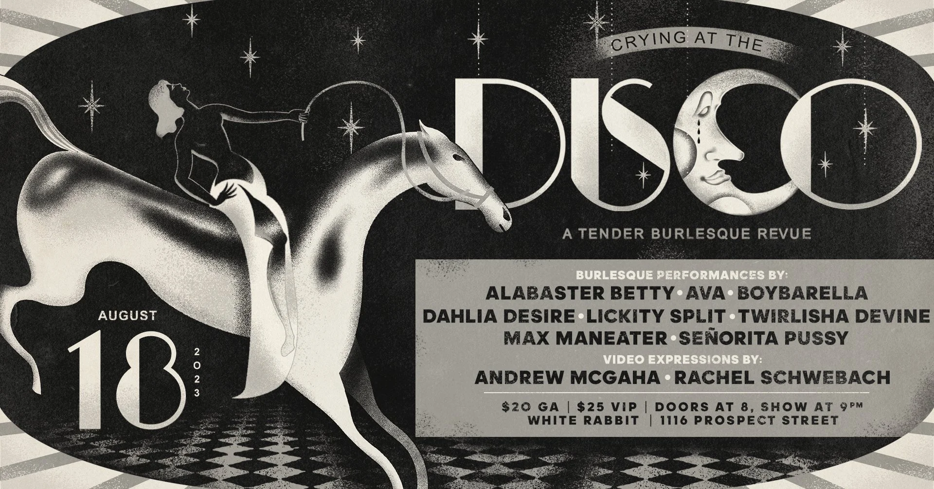 Join the artists of Crying at the Disco: A Tender Burlesque Revue at the White Rabbit Cabaret on Friday, August 18, 2023! Through performances and videos the inner worlds of our cast are revealed. You may even see something of yourself on stage. Whether we’re crying from a bittersweet memory or laughing to the point of tears, the works you see will celebrate our innate humanity. Come experience a full range of emotions, from melancholy to titillation, as you watch our cast float across the stage like reflections off of a disco ball!