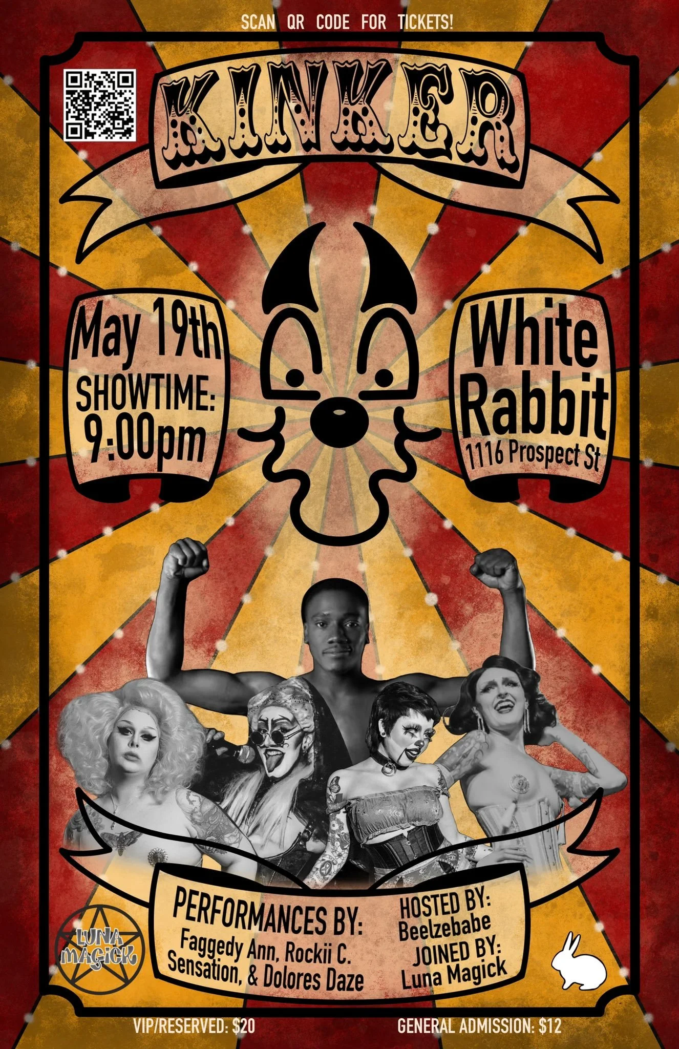 Ring Master Beelzebabe has a cast of KINKERS who will surely leave you amazed! Come see the strange and creepy world of Beelzebabe’s side show acts and band of misfits take over the White Rabbit.