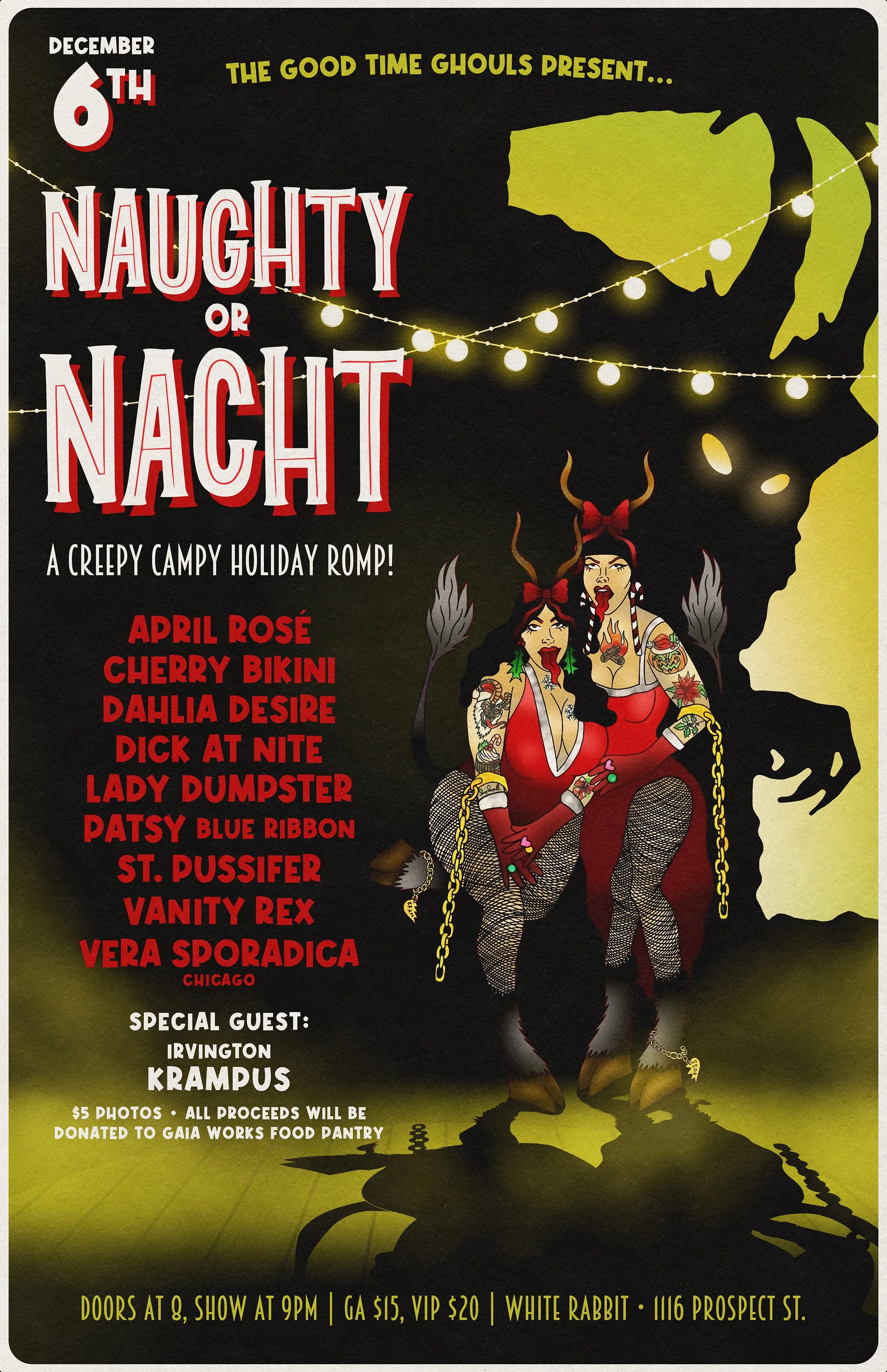 Join us for a night of laughter, allure, and a sprinkle of fright at Naughty or Nacht! Whether you’re naughty or nice, there’s something for everyone in this unforgettable holiday spectacle. Don’t miss out on the merriment – get your tickets now!