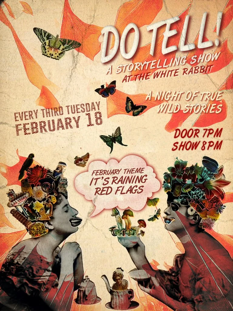 Every month the storytellers will bring their true tales to the White Rabbit stage tackling a new subject. February theme is “IT’S RAINING RED FLAGS”