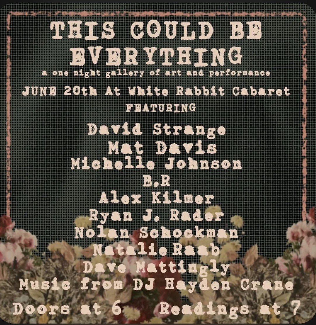 This Could Be Everything is a collaboration between visual and spoken word artists that aims to find the message in the media. This one-off gallery event is geared to those who want to mingle, chat, and find the ever-fruitful middle ground of art and poetry. We hope our audience will peruse the booths of our visual artists while taking the time to listen to our spoken word performers take turns on the stage.