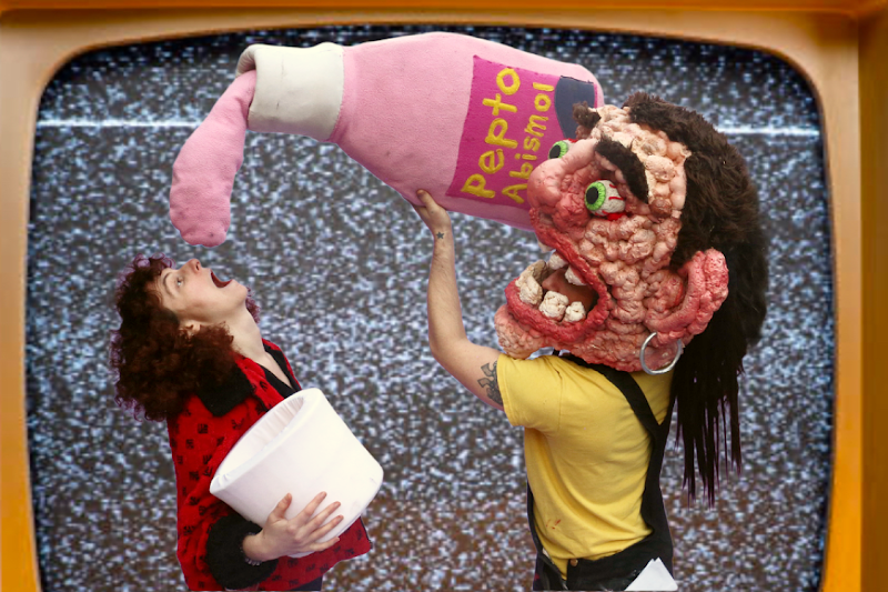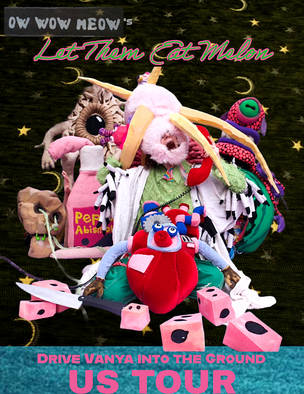oW wOw mEow presents their surrealist puppet punk show: Let Them Eat Melon: A puppet show inside a watermelon, inside a stomach, inside of a anti folk music show, looking at themes of microbial ecosystems, health autonomy, death and decay, and connecting systems of body to systems of ecology and politics. We use music and puppetry to explore how the worlds inside us connect us to the worlds beyond us and create stories that are equal parts hilarious, grotesque, and beautiful.