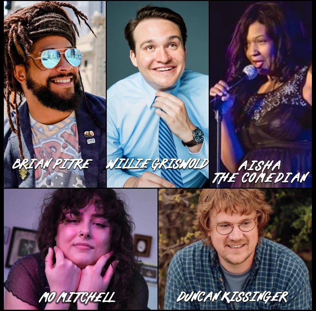 Live stand-up comedy featuring Aisha the Comedian, Duncan Kissinger, Brian Pitre, Mo Mitchell, and Willie Griswold