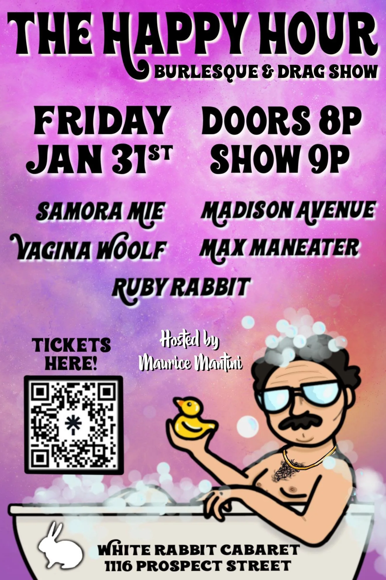 Join your favorite drag daddy, Maurice Mantini, for a night of thirst-busting entertainment! Wet your whistle at the White Rabbit’s top-notch bar and settle in for a helluva show. Drink in the lights, the music, and finally—the sensual, unconventional, and utterly mind-blowing talent taking the stage. Maurice is serving you a mix of regional drag and burlesque performers offering up acts that will make you blush and leave you begging for more.