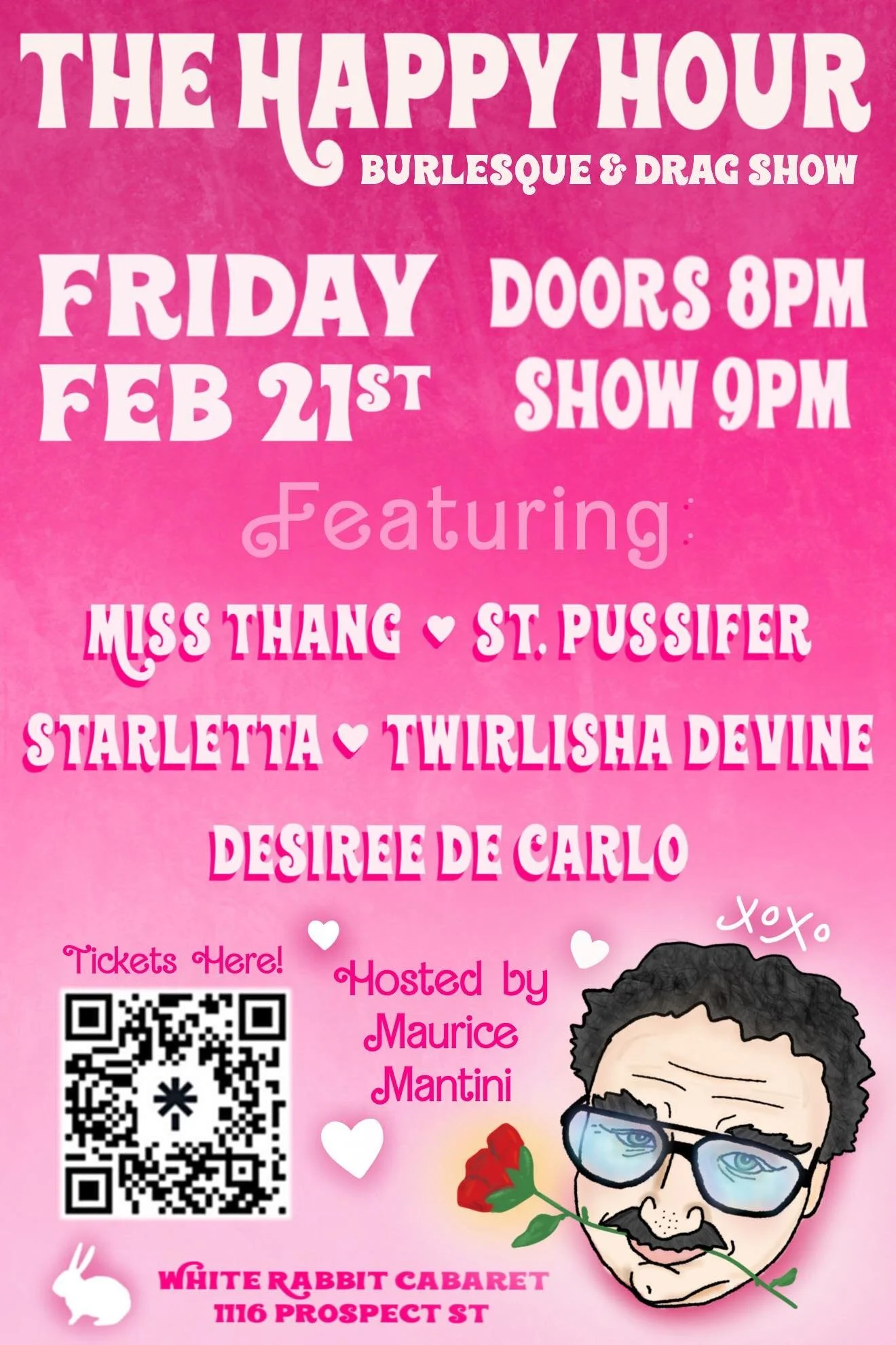 Join your favorite drag daddy, Maurice Mantini, for a night of thirst-busting entertainment! Wet your whistle at the White Rabbit’s top-notch bar and settle in for a helluva show. Drink in the lights, the music, and finally—the sensual, unconventional, and utterly mind-blowing talent taking the stage. Maurice is serving you a mix of regional drag and burlesque performers offering up acts that will make you blush and leave you begging for more.